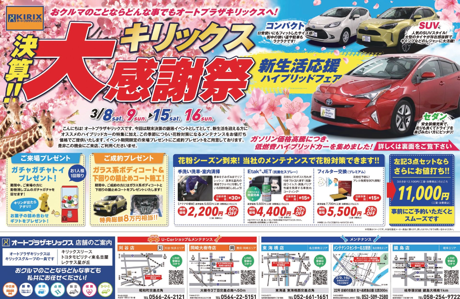 🎉✨決算セール開催!✨🚗 2025年3月7日 最終更新日時 : 2025年3月7日 KIRIX LEASE3月8日(土)~3月16日(日) 限定!🌟 ハイブリッドカーが決算特価!🌟燃費◎&環境に優しい!🎁 ご来場特典 お子さまも楽しめる♪ カプセルトイをプレゼント!🚗 ご成約特典 ボディーコーティング 無料でピカピカに✨🌿 花粉対策応援! エアコンフィルター交換などを、特別価格でご提供!在庫限り!お早めに!ご来店お待ちしております🚘💨FacebooktwitterCopy